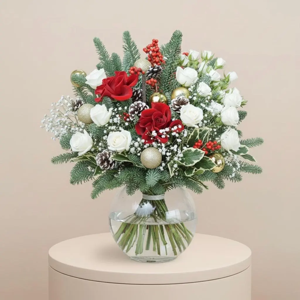 Bring festive elegance into your home with the Frosted Christmas Luxury Vase Arrangement, a sophisticated blend of traditional Christmas colours and winter textures. This striking design showcases premium red roses, white roses, hypericum berries, pinecones, baby’s breath, and golden baubles, all arranged in a clear round vase for a fresh, modern touch.