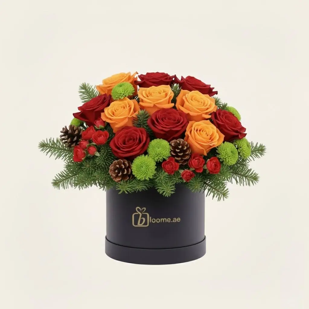 • A luxurious Christmas flower box featuring vibrant red and orange roses, pinecones, berries, and festive greens – arranged in a premium Bloome black hatbox.